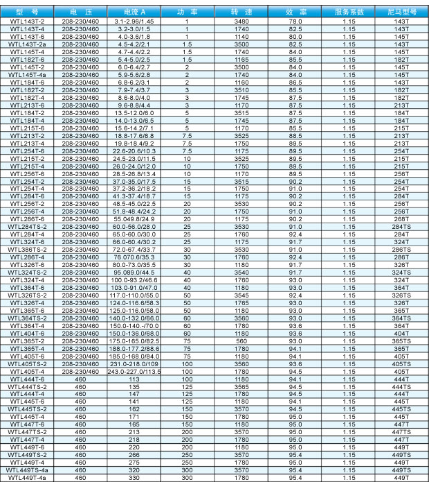 該系列電機為全封閉自扇冷式三相異步電動機,符合美國電氣制造商協(xié)會Nema的相關標準,電機采用F級絕緣,尼馬B設計或C設計,功率范圍從1馬力到300馬力,涵蓋2、4、6、8極,產(chǎn)品已獲得美國及加拿大政府的相關能效認證,證書號CC0082A及EEV2234888,亦獲得UL及CSA安全認證。